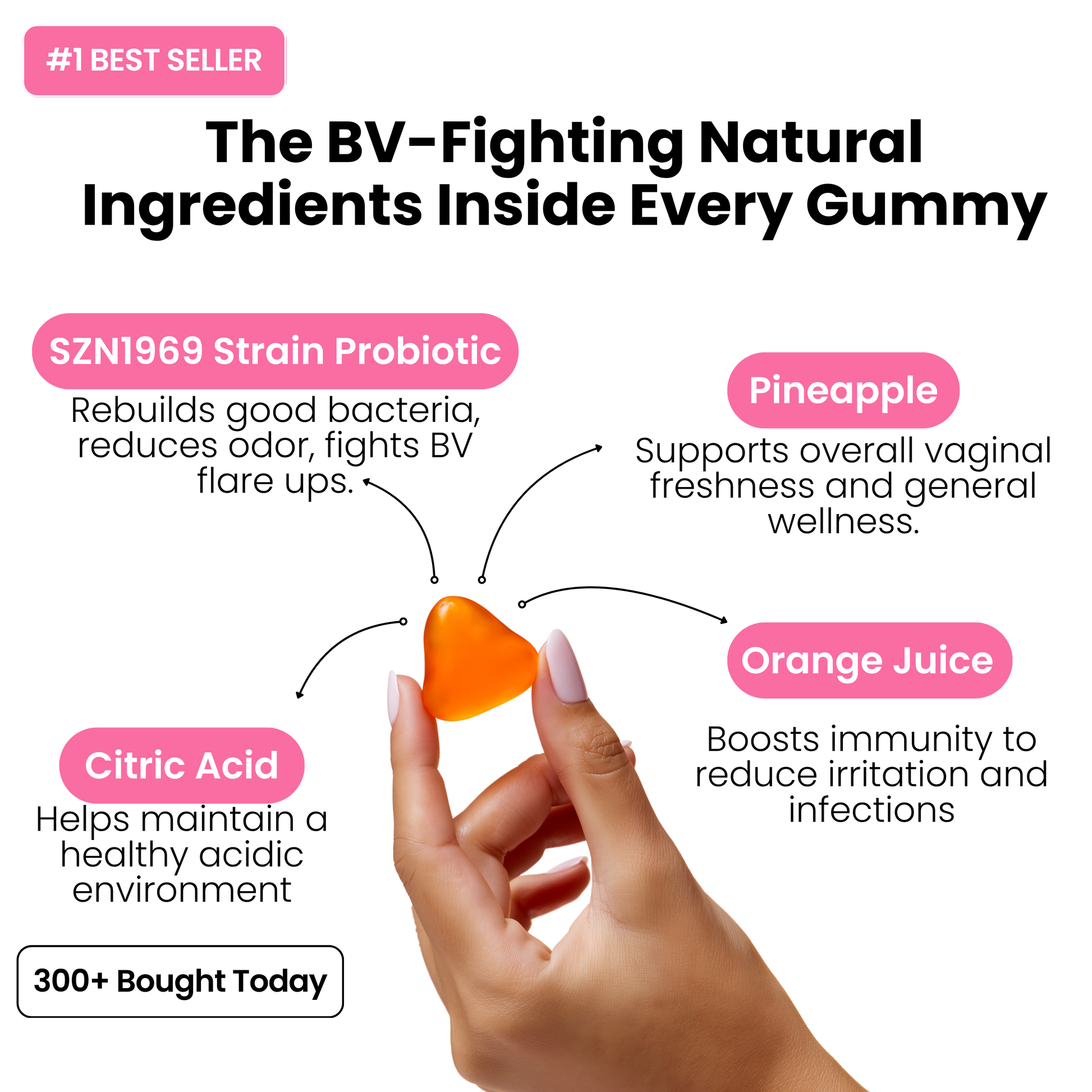 The first daily gummy made to help stop BV flare patterns by supporting healthy pH, odor control, and everyday comfort with a clinically studied probiotic strain SNZ1969.